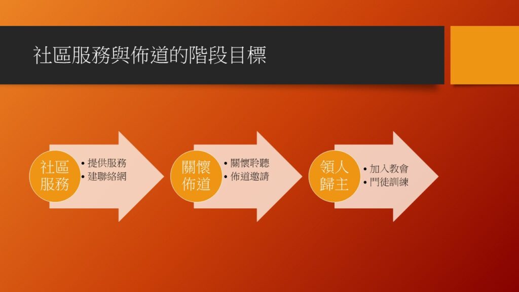 在生活裡,隨時隨地都有傳福音的機會,我們要培養起對社區需要的敏感度,帶著基督的愛,向不同文化、語言、背景的人提供適時的幫助,無論在機構前台、居所附近、各類社區中心或活動,甚至去診所看醫生,在生活的每一個層面,求神讓我們能用心聽見、看見鄰舍的處境和需要,樂於與人建立關係,愛鄰舍、為人多走一里路,為社區帶來改變。