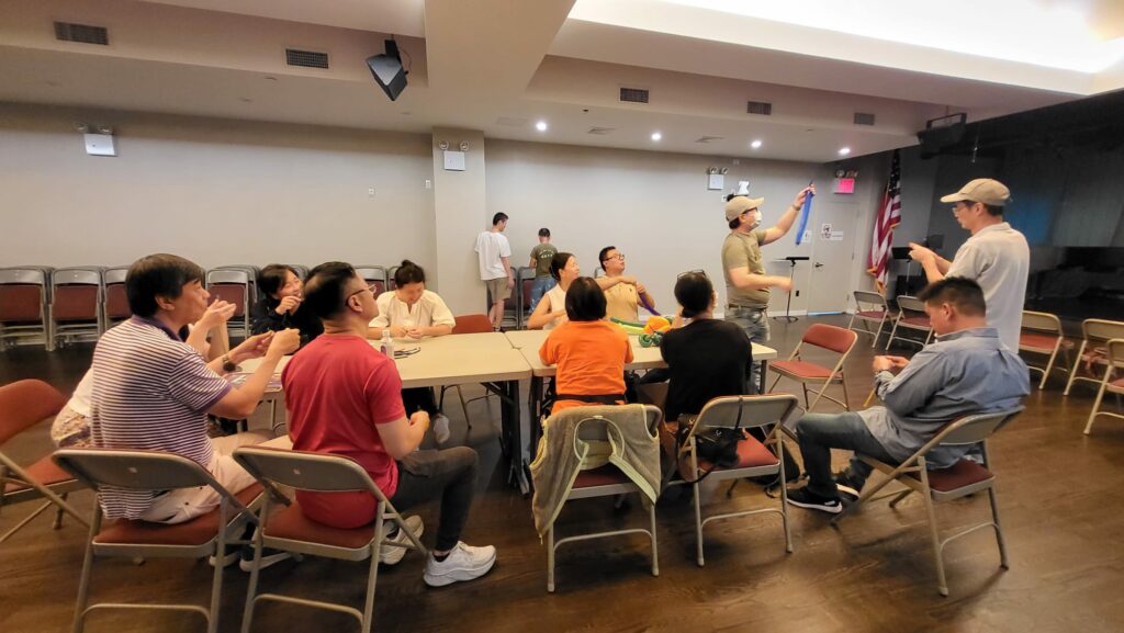 下午的課堂移師到角聲福音廣場,由角聲紐約事工總幹事陳熾牧師介紹角聲城市佈道的各項事工,闡述「社會關懷宣教模式」的理念。隨後學員們饒有趣味地圍繞着角聲同工張宏哲弟兄,一同學習扭氣球,並將成品並最新一期《號角月報》送給法拉盛街頭路人,實踐街頭佈道。